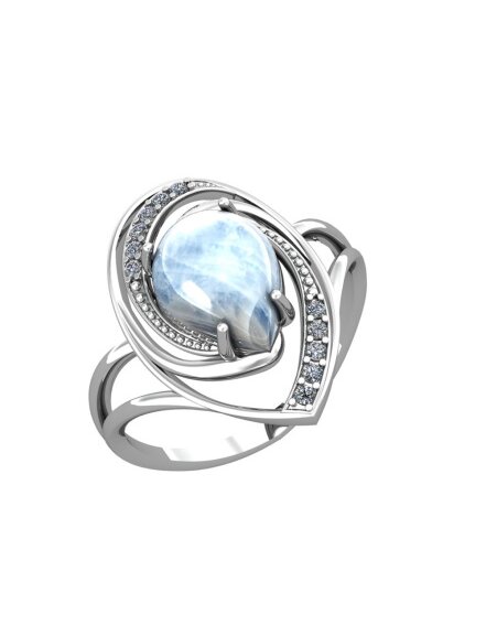 281383-FA15LN Кольцо - это ювелирное изделие из серебра 925 пробы с фианитами. Оно предназначено для ношения в качестве украшения (аксессуара), добавляющего блеск благодаря вставкам из фианитов. Фианиты имитируют бриллианты благодаря высокой прозрачности и сильному блеску. Покрытие - родирование. Вставка - 1 лунный натуральный, 11 фианит голубой. Средний вес - 2.10 гр.