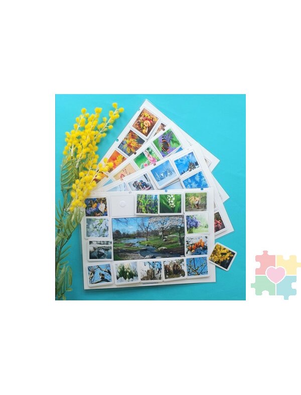 4 сезона. Развивающие пособия на липучках - это яркая и красочная игра, которая поможет показать детям то, как выглядит тот или иной сезон и время года, какие есть отличия и особенности. Эта игра уникальна тем, что все карточки и листы несут на себе не просто нарисованные картинки, а настоящие фотографии каждого из сезонов. Тут есть фотографии желтых листов для осени, полей, бабочек и ромашек для лета, снежных сугробов и заносов для зимы и оттаивающих улиц и солнца для весны а также многое другое. Дети смогут найти фото животных, насекомых, растений, деревьев, различных действий и событий. Каждый лист и карточка из набора изготовлен из качественной ламинированной фотобумаги. Такой материал выдерживает большое количество занятий с маленькими исследователями. Состав - 4 листа по 14 карточек с изображениями времен года.