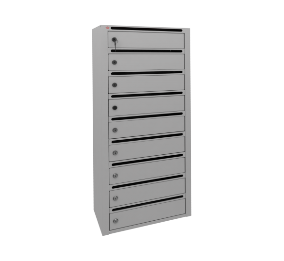 Габариты: 380х937х180 Покрытие: Полимерно-порошковое Материал: Сталь 0,6 мм (Дверки сталь 1,0 мм) Cекций: 9 Глубокий вертикальный 10-и секционный почтовый ящик усиленной конструкции серии «Гарант» для подъездов многоквартирных домов с прямым горизонтальным дном имеет усиленную конструкцию корпуса и выполнен из холоднокатанной стали. Дверцы почтового ящика имеют толщину металла 1 мм. Открытие дверок производится слева направо. Конструкция почтового ящика предусматривает возможность перевешивания дверок на противоположную сторону (справа налево). Корреспонденция располагается в секции горизонтально.