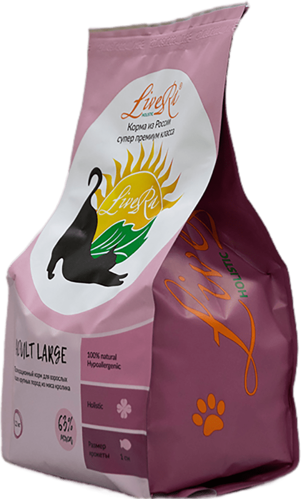 LiveRa ADULT LARGE ( рагу с нежным мясом кролика) 63% мяса — корм для взрослых кошек крупных пород LiveRa — сбалансированный рацион на основе мяса индейки и кролика, содержащий в себе оптимальное сочетание жиров, всех необходимых витаминов и минералов, который позволит обеспечить Вашей кошке долгую здоровую активную жизнь и прекрасную физическую форму на длительное время. Состав корма способствует сохранению эластичности кожи и приданию блеска шерсти, повышает иммунитет, сохраняет зрение, обеспечивает здоровый опорно-двигательный аппарат, стабилизирует работу пищеварительной системы, улучшает работу мочеполовой системы. Специальный размер гранул предотвращает слишком быстрое поглощение корма, которое может привести к проблемам с пищеварением. Также в процессе разгрызания особая структура гранул способствует укреплению зубов и десен и их механической чистке. Поэтому корм лучше давать животному сухим и следить при этом, чтобы постоянно была свежая вода в свободном доступе.