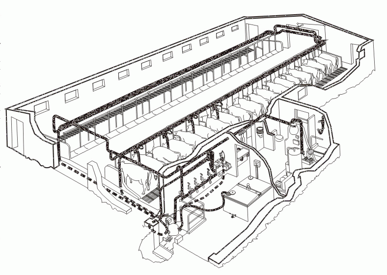 Состав: молокопровод, вакуумпровод, доильный аппарат парного давления, автомат промывки или механизированная промывка, молокоприемник, пластинчатый охладитель.