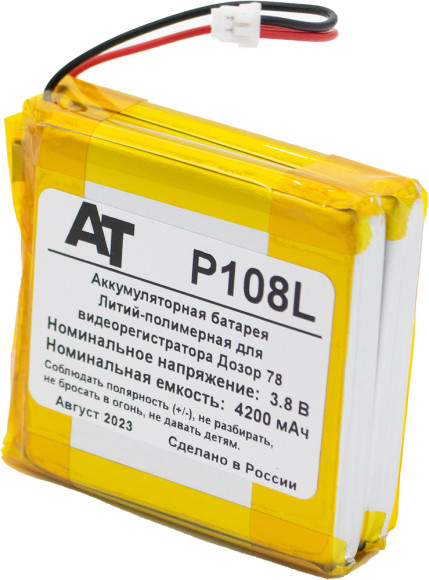 Аккумулятор AT P108L (Li-pol, 3.8В, 4200мАч) - Дозор 78 предназначен для питания электронной аппаратуры, приборов и устройств, в которых используется литий-полимерный аккумулятор. Он применяется в портативной электронике, такой как гарнитуры Bluetooth, видеорегистраторы, навигаторы, MP3-плееры и другие устройства. Вольтаж - 3.8В., ёмкость - 4200 мАч., размеры - 13 x 43 x 45мм. вес - 58г.