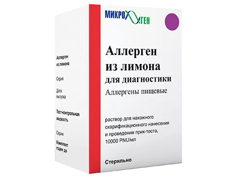 Аллерген из лимона для диагностики - это водно-солевой экстракт мякоти и цедры лимона, содержащий специфические белки. Он применяется для точного выявления аллергии к лимону (IgE-опосредованной) методом кожных проб (прик-тест), определения причины пищевой аллергии, атопического дерматита, бронхиальной астмы. Лекарственная форма - раствор для накожного скарификационного нанесения и проведения прик-теста, по 4,5 мл аллергена, по 4,5 мл тест-контрольной жидкости в стеклянных флаконах вместимостью 5 мл, укупоренных резиновыми пробками и закатанных алюминиевыми колпачками. Комплект состоит из 1 флакона аллергена, 1 флакона тест-контрольной жидкости, помещенных в пачку из картона с инструкцией по применению.