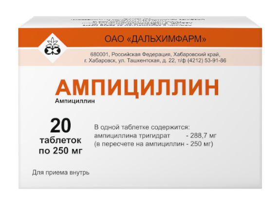 Ампициллин - это полусинтетический антибиотик широкого спектра действия из группы пенициллинов. Ампициллин эффективен против многих грамположительных и грамотрицательных бактерий, подавляя синтез их клеточной стенки. Применяется для лечения бактериальных инфекций дыхательных, мочевыводящих путей, ЖКТ, ЛОР-органов, а также инфекций кожи и мягких тканей. Выпускается в основном в виде таблеток по 250 мг., в количестве 20 штук в упаковке.