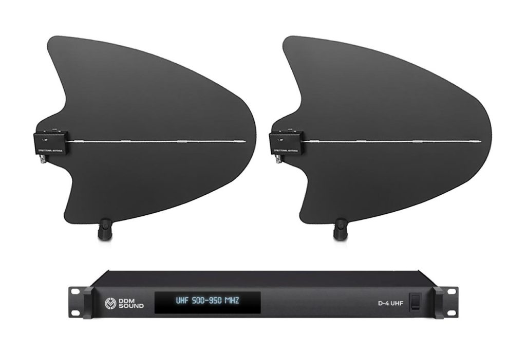 Модель DDM Sound D-4 UHF: Четырёхканальный антенный сплиттер/усилитель с направленными антеннами Диапазон несущих частот: 470-950 мГц Полоса пропускания: 450 МГц Выходное постоянное напряжение: от 14 до 18 В, 4 разъема Постоянное напряжение питания антенны: 12 В Сопротивление: 50 Ом Входной/выходной разъем радиосигнала: BNC Температура эксплуатации: от –6° до 50° C Источник питания базы: 100-240 В, 50/60 Гц Комплектация: блок питания -1шт, кабель питания для подключаемых радиосистем - 4шт, антенные кабели (BNC) - 4шт, установочный комплект для антенн(BNC) - 2шт, антенна - 2шт, набор крепления - 2шт, алюминиевый кейс для траснпортировки, стойки Общие габариты: 44 (В) × 482 (Ш) × 171 (Г) мм Вес: 1.7 кг