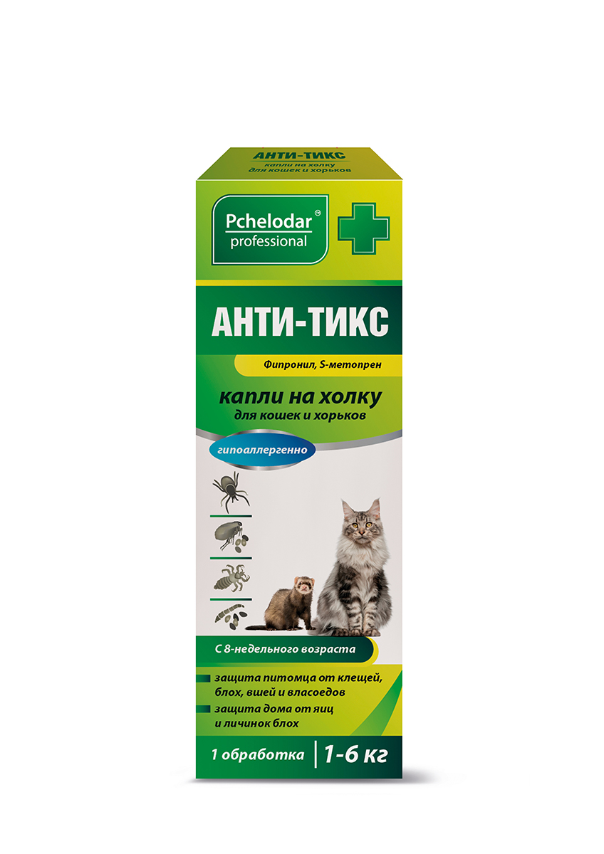 АНТИ-ТИКС для кошек и хорьков - это лекарственный препарат, который назначают собакам, кошкам и хорькам для лечения и профилактики: акарозов, вызываемых иксодовыми клещами; энтомозов, вызываемых блохами, вшами, власоедами. Лекарственный препарат Анти - тикс применяют также в комплексной терапии аллергического дерматита, возникающего из-за укусов насекомых. По внешнему виду лекарственный препарат представляет собой прозрачную маслянистую жидкость от светло-желтого до желто-коричневого цвета. Лекарственный препарат Анти-тикс выпускают расфасованным по 0,4, 0,7, 1,4 и 2,1 мл в полимерные пипетки соответствующей вместимости, упакованные по 1, 2 или 4 штуки в картонные пачки. Каждую потребительскую упаковку снабжают инструкцией по применению и наклейками для ветеринарного паспорта. Лекарственный препарат Анти-тикс вызывает аномалии развития насекомых на стадии яйца и личинки, предотвращая появление взрослых эктопаразитов на животных и в местах их содержания. Средство применяют собакам и кошкам с 8-недельного возраста, хорькам с 6-месячного возраста.