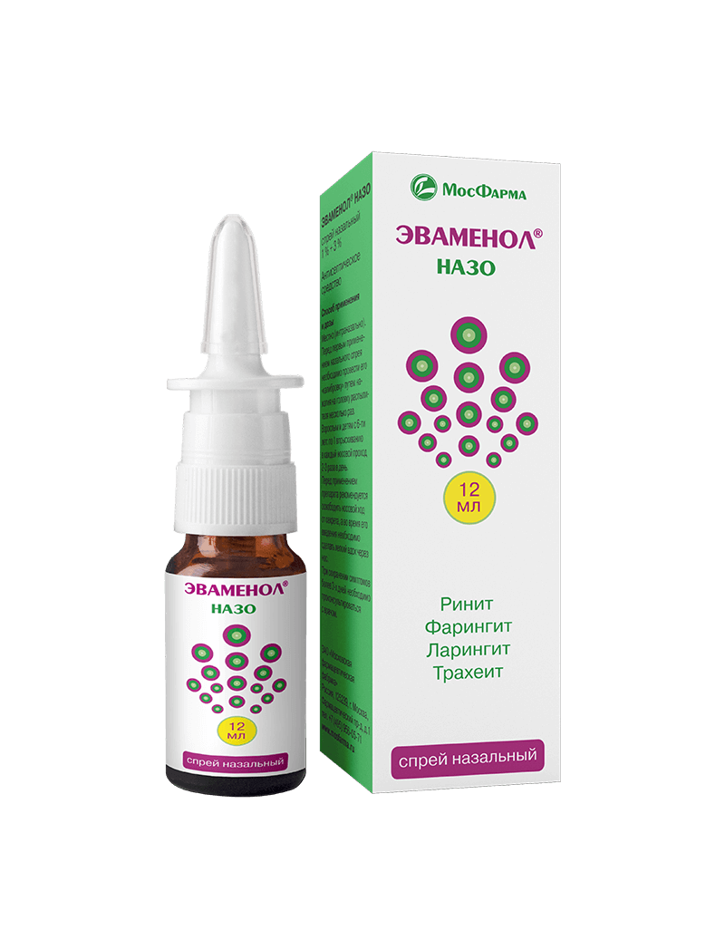 Эваменол® Назо уменьшает выделение избыточной носовой слизи и снижает воспаление слизистой носа при рините, фарингите, ларингите, трахеите.