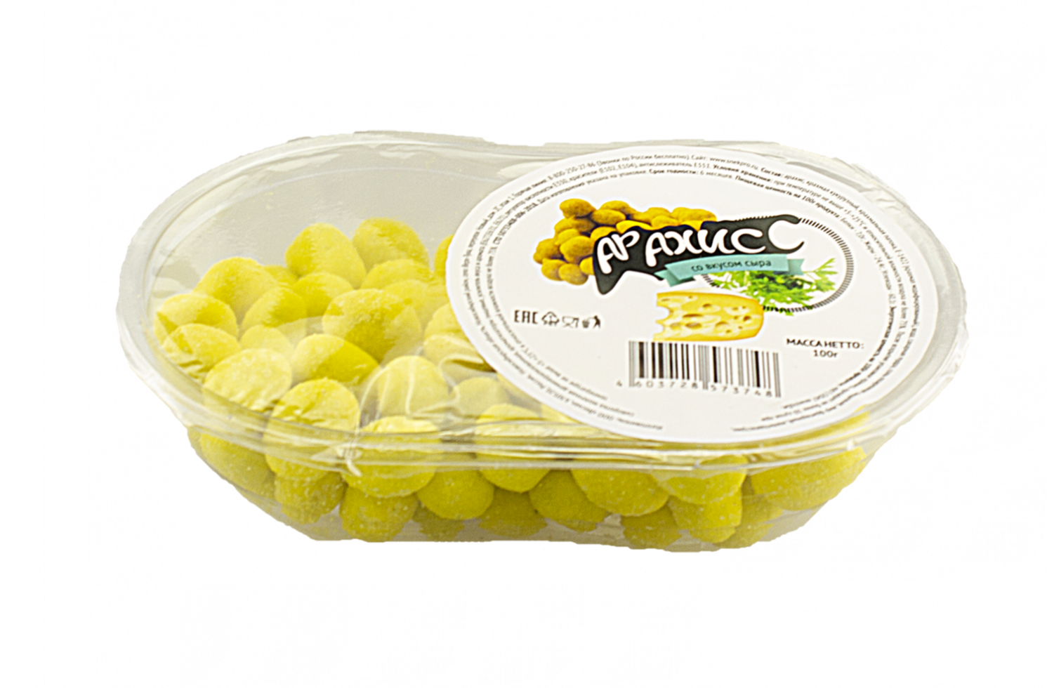 Арахис в хрустящей корочке со вкусом сыра — популярный снек, состоящий из обжаренных ядер арахиса, покрытых хрустящей оболочкой из пшеничной муки, кукурузного крахмала и вкусоароматических добавок. Это соленая закуска, часто используемая как альтернатива чипсам, с выраженным сырным ароматом.