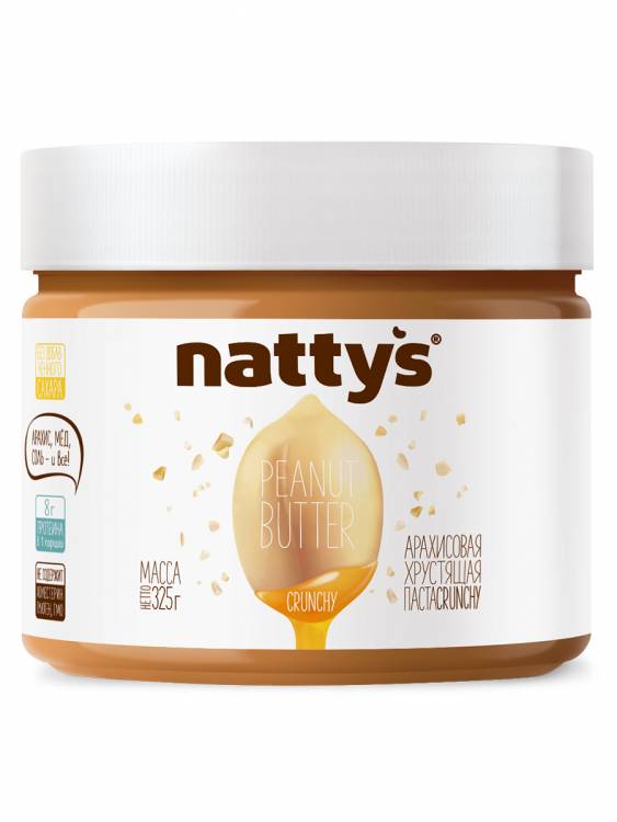 Солено-сладкая хрустящая Арахисовая паста Crunchy Nattys® - абсолютно натуральная и очень вкусная: в составе только арахис, кусочки дробленого арахиса, немного мёда и морской соли. Источник белка и правильных растительных жиров. Правильный перекус, вкусный десерт, сытный завтрак - твой Nattys®!