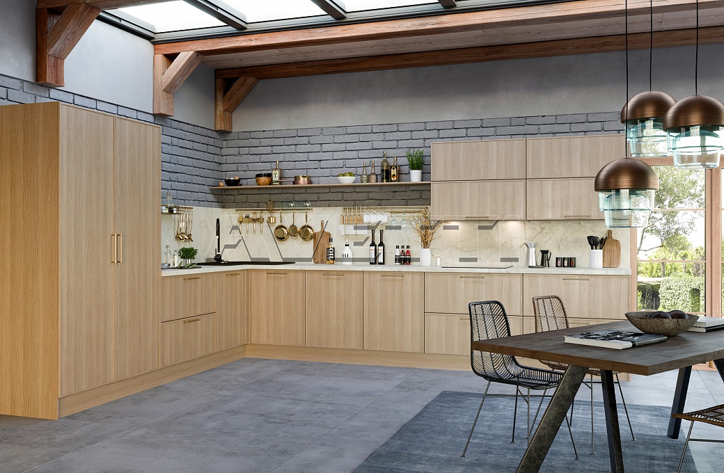 Модель придется по душе ценителям эко стиля. Специальное бесцветное покрытие оберегает естественную красоту ясеня. Тонкое обрамление фасада делает архитектуру кухни более четкой. Благодаря достаточному количеству света, изящной фурнитуре и частичному присутствию верхних шкафов проект выглядит легко.