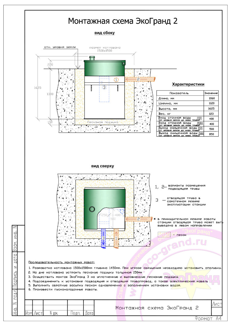 Автономная канализация Эко-Гранд 2 ПР с одним компрессором, где выход стоков из станции происходит принудительным способом, то есть дополнительно в систему очистки встраивается дополнительный насос. Очищенная вода выбрасывается насосом в дренажный колодец, придорожную канаву или на рельеф.Максимальный приток канализационных стоков, который может переработать эта станция в сутки, не может превышать 0,2 м3.В сутки Эко-Гранд 2 ПР потребляет электроэнергию в размере 0,9 кВт⋅ч. Весит такая установка 123 кг, а её размеры составляют 1080х1120х1620 м (длина х ширина х высота).Корпус изготовлен из высококачественного полипропилена, толщина стенок 15мм, толщина дна 20мм.