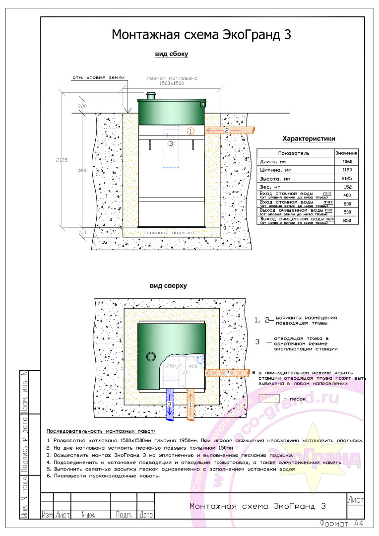 Автономная канализация Эко-Гранд 3 с двойным компрессором выход стоков из станции происходит самотёчным способом, то есть дополнительно в систему очистки не встраивается никаких насосов. Очищенная вода самостоятельно протекает в дренажный колодец, придорожную канаву или на рельеф.Максимальный приток канализационных стоков, который может переработать эта станция в сутки, не может превышать 0,65 м3.В сутки Эко-Гранд 3 потребляет электроэнергию в размере 0,9 кВт⋅ч. Весит такая установка 200 кг, а её размеры составляют 1080х1120х2130 м (длина х ширина х высота).Корпус изготовлен из высококачественного полипропилена, толщина стенок 15мм, толщина дна 20мм.