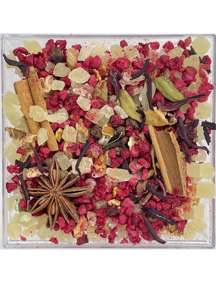 Малина сублимированная, гибискус, яблоко, цедра апельсина, гвоздика, кардамон, бадьян, корица, цукаты ананаса.