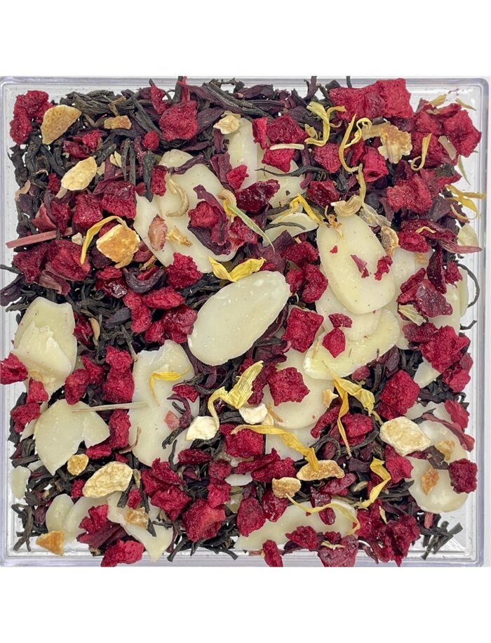 черный чай, миндаль, вишня сублимированная, яблоко сублимированное, цукаты ананаса.