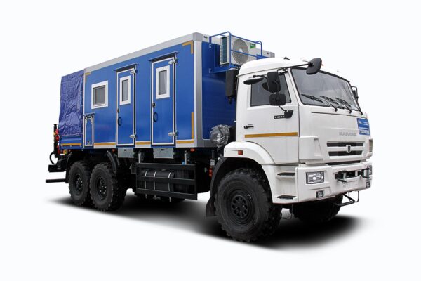Передвижная авторемонтная мастерская с КМУ Инман ИМ-77 на шасси Камаз 43118 предназначена для оперативного ремонта и технического обслуживания в полевых условиях. Передвижная мастерская оборудована отсеком для перевозки людей, рабочим отсеком, бортовой платформой с тентом и каркасом, а также крано-манипуляторной установкой ИМ-77. Фургон выполнен из сэндвич-панелей прямоугольной формы с утеплителем толщиной 60 мм. Внешняя обшивка из водогрязеотталкивающего пластика, армированного стекловолокном, устойчива к воздействию окружающей среды. Внутренняя отделка представлена пластиком белого или серого цвета, также армированным стекловолокном. Бортовая платформа длиной 1,5 м. оборудована тентом и каркасом.