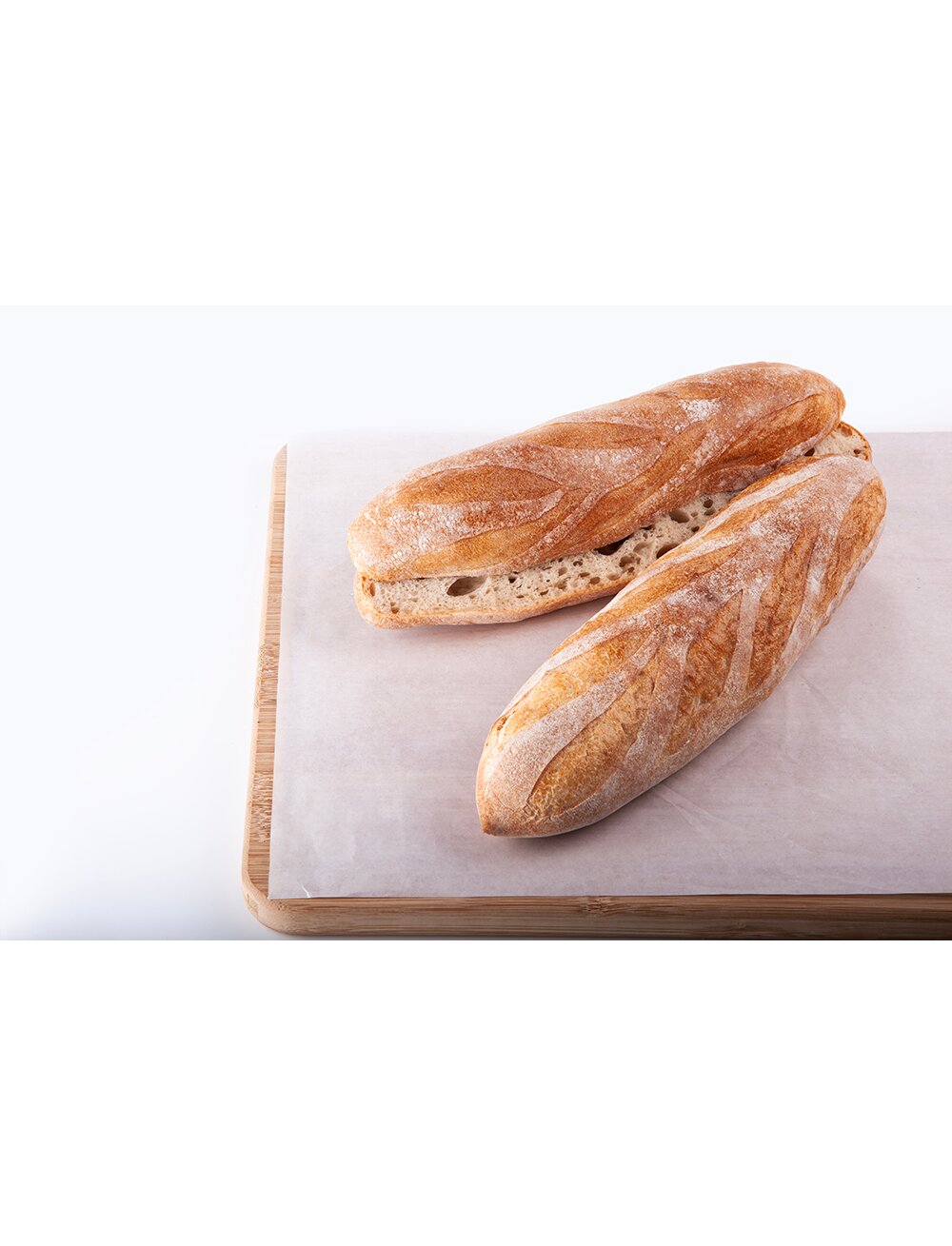Багет с густым пшеничным ароматом, структура мягкая и пористая, с увлажнёнными, но воздушными волокнами.