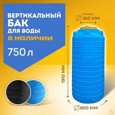 Бак вертикальный для воды 750 л - это пластиковая (из пищевого полиэтилена) цилиндрическая емкость, предназначенная для компактного хранения запаса питьевой или технической воды. Благодаря узкой вертикальной форме (высота часто около 1.5–2 м), он занимает мало места, проходя в стандартные дверные проемы. Диаметр - 800 мм. Высота с крышкой - 1910 мм. Диаметр крышки - 360 мм. Размер фитинга - 20 мм. Цвет - синий, черный. Тип расположения - вертикальный. Тип крышки - винтовая. Максимальная рабочая температура - 60 °С. Минимальная рабочая температура - -20 °С.