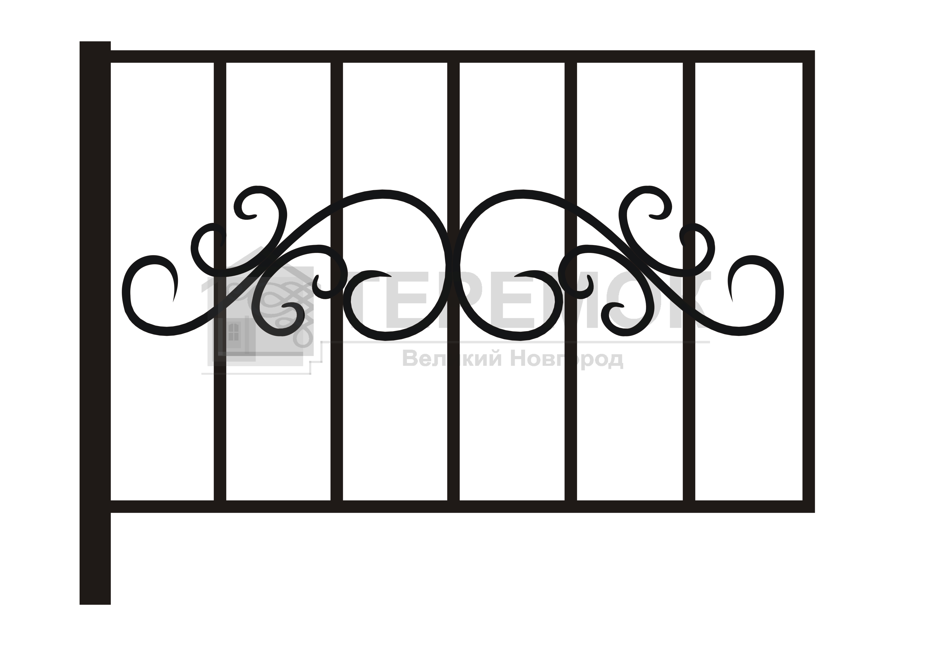 Высота рисунка - 0,9 м. Цена - 5900 руб/метр пог. Материалы: Верх – труба профильная 40х20 Низ – труба профильная 25х25 Заполнение + декор – труба профильная 15х15 Размер - по запросу заказчика Дополнительно: Покраска порошковое напыление - 1200 руб/метр пог Патинирование (золочение) – 500 руб/метр пог. Столб L=1,0 – 450 руб/шт Пластина крепежная в пол/стену – 250 руб/шт Короб для крепежной пластины – 300 руб/шт Декор-приглашение – 1200 руб/шт. Полоса сверху кованая – 700 руб/метр пог. Пластиковая заглушка – 80 руб/шт Металлическая заглушка – 100 руб/шт Секции перил под углом + 20% стоимости Радиусные (полукруглые) перила +40% стоимости