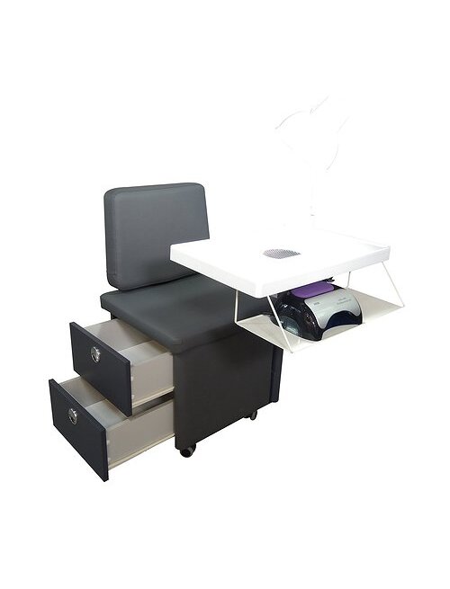 Банкетка для экспресс маникюра с электродвигателем - это компактное рабочее место "всё в одном", предназначенное для быстрого оказания услуг в местах с высокой проходимостью: ТЦ, аэропортах, салонах красоты. Его уникальность в том, что он сочетает в себе столик со встроенным пылевсасывающим устройством, светильник, полку под лампу для сушки ногтей. Для удобства работы данный комплекс имеет возможность изменения высоты сидения при помощи Э/двигателя (с ручным пультом управления). Пуф имеет мягкое сиденье со спинкой, и выдвижные ящиками. Данный комплекс можно использовать как для малогабаритного кабинета, так и в комплексе с педикюрным креслом. Габаритные размеры изделия: высота со спинкой -770-870 мм., высота сидения - 510-610 мм., длина - 500 мм., ширина - 450 мм. Изделие оборудовано поворотным столиком с встроенным в него пылесосом для маникюра. Столик имеет регулировки по высоте и углу поворота. Габаритные размеры столика: высота столика -от 750 до 920 мм. ширина - 350 мм., поворачивается на 90º. С внешней стороны столика установлена полка под ультрафиолетовую лампу. Также на столешницу устанавливается настольная лампа для освещения рабочей зоны. Корпус банкетки оснащен двумя розетками 220 В., обшит кожзаменителем и имеет 2 выдвижных ящика.