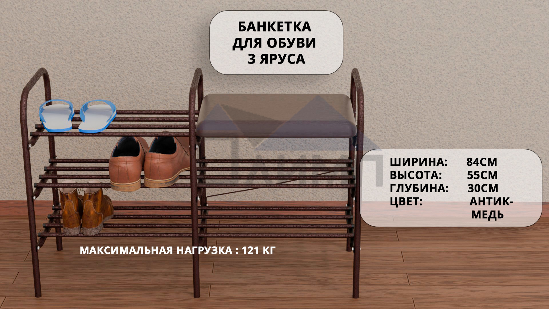 Продаем двух-, трех- и четырехъярусные полки для обуви оптом от производителя. Их можно использовать в любом помещении, будь это прихожая в квартире или офис в бизнес-центре. Каждое изделие соответствует указанным в описании параметрам и поставляется в индивидуальной картонной упаковке. Преимущества представленной продукции. Этажерки для обуви — сравнительно недорогие и в то же время качественные, функциональные и практичные изделия. Цена зависит от размеров конструкции, количества ярусов и материалов изготовления. Основные плюсы: Банкетка для обуви 3 яруса (античная медь) Рассчитана на 10 пар обуви; Максимальная нагрузка - 121кг. Материал - стальная труба/экокожа; Цвет - античная медь; Ширина - 84см; Высота - 55см; Глубина - 30см; Объем - 0,035м3; Вес - 6,5кг. Отгружаются кратно 2шт.