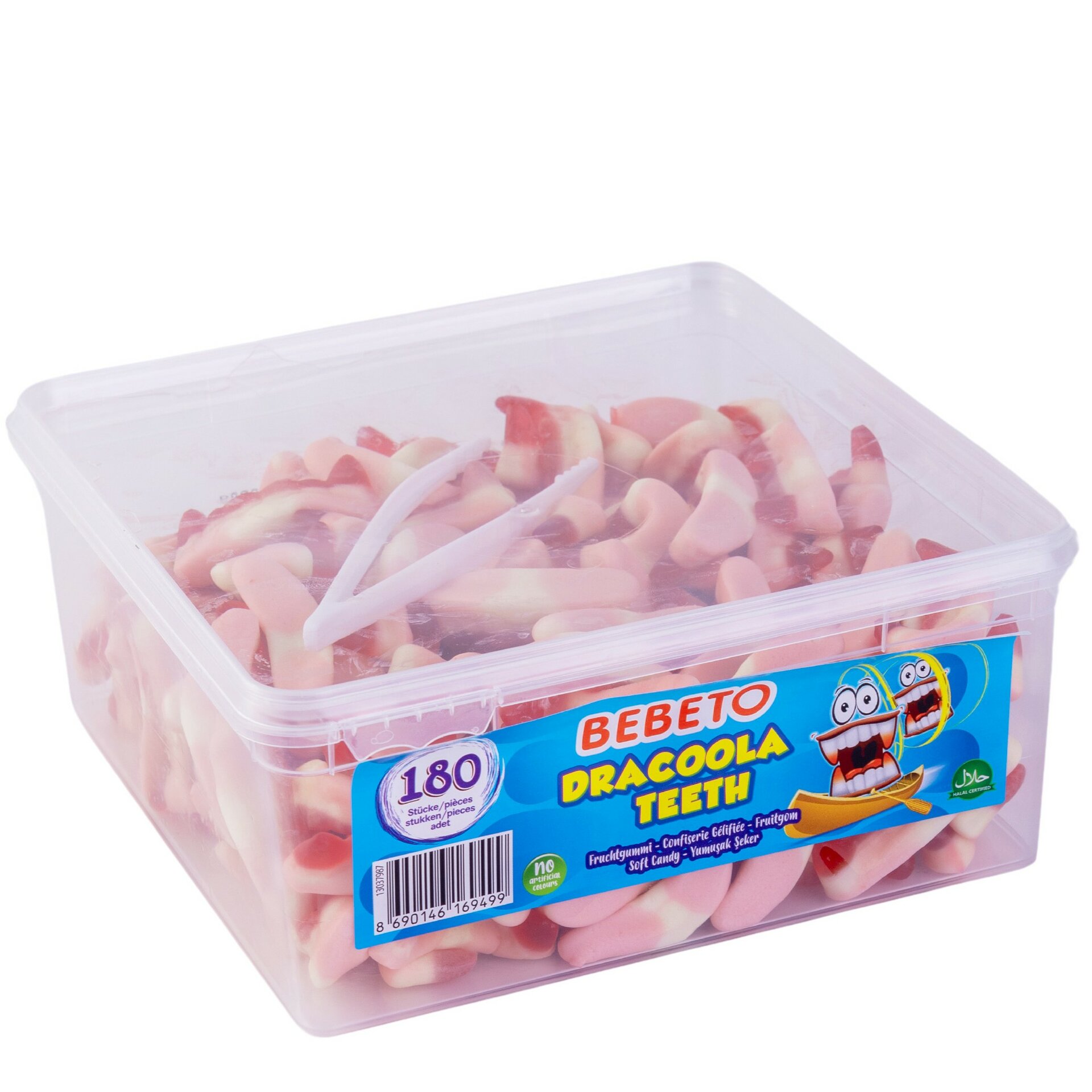 Жевательный мармелад со вкусом клубники и ванили в виде "зубов Дракулы". Удобный пластиковый бокс оснащен плотно закрывающейся крышкой, предотвращающей высыхание продукта, а также щипцами.