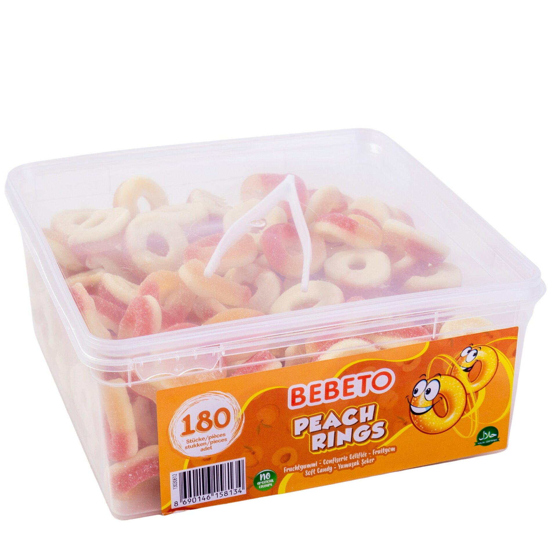 Жевательный мармелад со вкусом персика в виде колечек. Удобный пластиковый бокс оснащен плотно закрывающейся крышкой, предотвращающей высыхание продукта, а также щипцами.