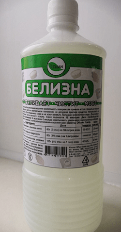 Белизна — это жидкое отбеливающее средство, которое применяется для отбеливания хлопчатобумажных и льняных тканей, а также для удаления пятен с ткани и гладких поверхностей. Подходит для мытья поверхностей из пластика, кафеля, ванн, раковин, унитазов и мусорных вёдер. Может использоваться для профилактической дезинфекции во время уборки. Объём — 1 литр.