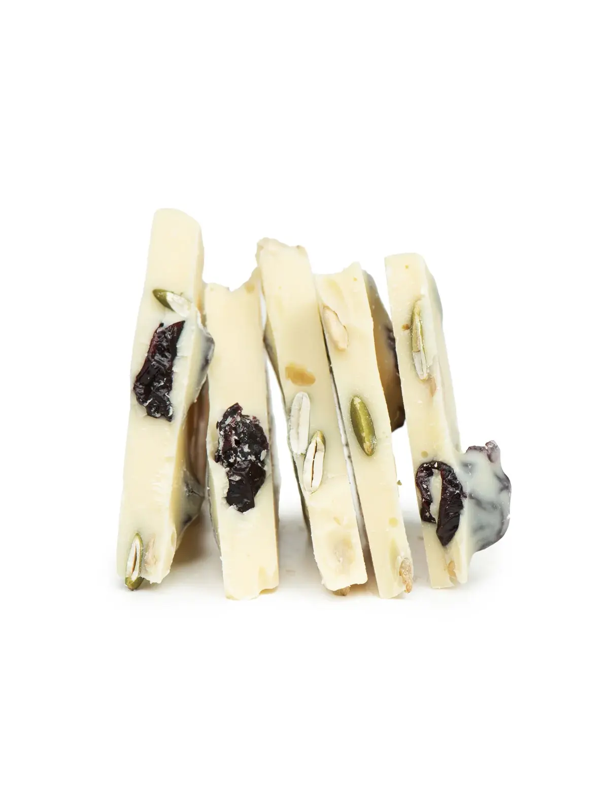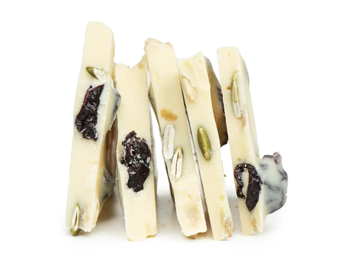 Кисло-сладкая вяленая вишня гармонична на фоне классического профиля сливочного белого шоколада, а хрустящие семена создают приятный контраст для его нежной текстуры.