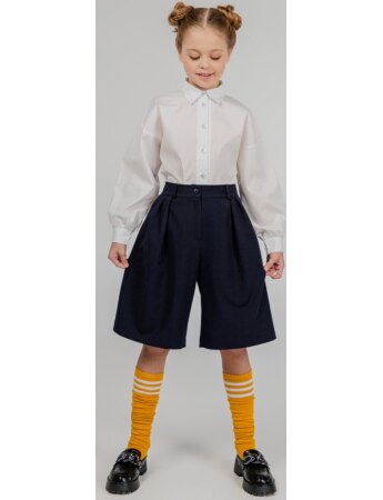 Бермуды №734 для девочки свободного покроя с боковыми карманами. Застежка-«гульфик» на молнию. Пояс со шлевками, вставлена резинка от бокового до бокового шва по спинке. Выполнены из костюмной ткани.