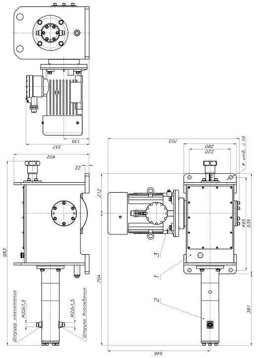 3.2. Бесклапанный дозируюзий насос(установка насосная) состоит из приводного механизма поз.1, насосного блока поз.2 и электродвигателя поз.3.