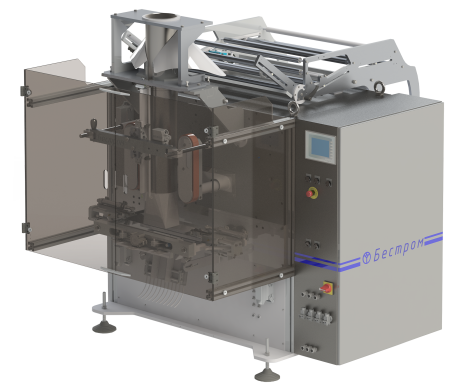 Упаковочная машина вертикальная «Бестром-420», предназначена для упаковки порошкообразных, гранулированных, мелкоштучных продуктов в пакеты из термосвариваемых пленок, подаваемых с рулона в виде полотна.