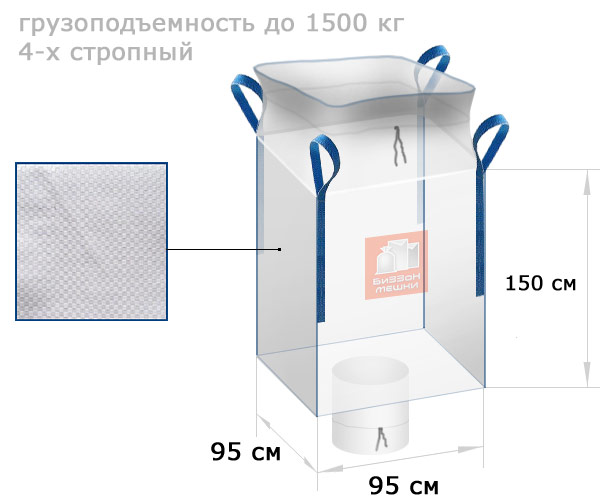 Гибкий контейнер из тканого полипропилена размером 95х95х150 см, рассчитанный на нагрузку до 1500 кг (1,5 т). Имеет 4 погрузочных стропы. Верхняя часть контейнера оснащена дополнительной вставкой из пп-ткани (сборка) для закрытия полного контейнера (на шнуре). Нижняя часть имеет "люк" - ПП-рукав со стяжкой на шнуре для закрытия. Такая конструкция позволяет производить аккуратную разгрузку контейнера с сыпучими материалами без потерь и пыли. Поставляются оптовыми партиями от 100 шт.