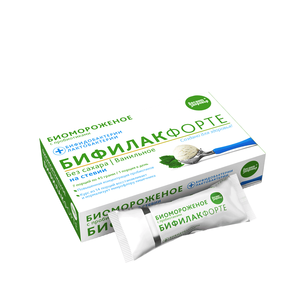 - По 1 порции биомороженого (45г) в день, ежедневно, без пропусков, в течение 3−4 недель. Этого достаточно для запуска восстановительных процессов в микрофлоре кишечника.
