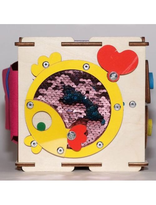 Бизикубик Рыбка - это набор из 6 стенок бизибордов и игр по методике Монтессори. Один такой бизикубик заменит до 6 игрушек. С помощью этой развивающей игрушки ребенок познает мир, он учится нажимать, открывать, крутить различные предметы, переключаться с одного вида деятельности на другой. Во время игры с бизи бордом у малыша активно развиваются мелкая моторика и логика, сенсорные и когнитивные способности: память, мышление, внимание, воображение, восприятие. Наполнение стенок: рыбка с пайетками, лабиринт с магнитной ручкой, дверца с часами и застежками петельками, кармашек с пуговицей, бусы на резинке и молния, сортер с геометрическими фигурами.