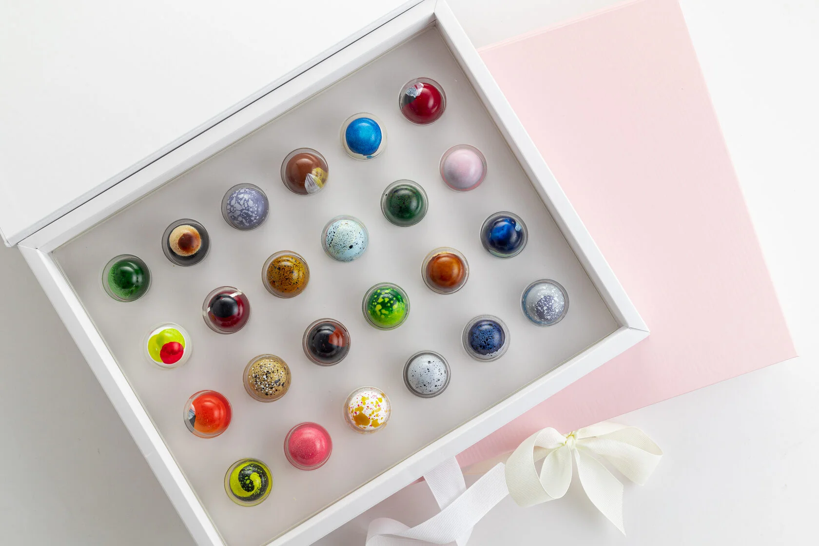 Ассорти из 24 авторских корпусных конфет. Каждая конфетка расписана вручную, сверху - шоколадная оболочка, а внутри начинка с добавлением натуральных фруктовых и ягодных пюре, орехов и специй.