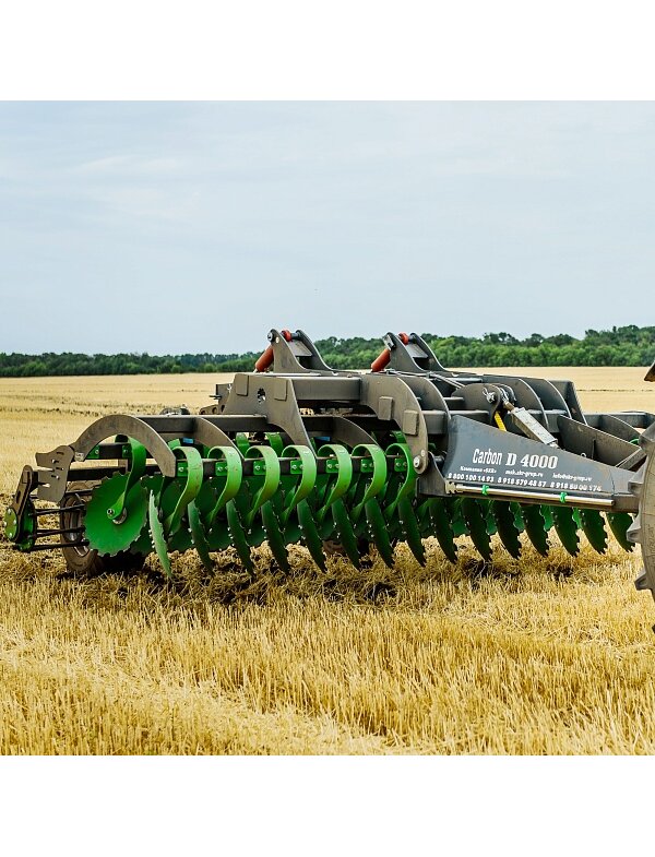 Борона Carbon D4000 предназначена для поверхностной стерневой обработки на лёгких и средних почвах, так и для предпосевной обработки почвы для посева по мульче или после вспашки. Может работать по влажной почве не забиваясь, идеально копирует практически любой рельеф почвы, за счет пружинной стоки, выдерживает заданную глубину по всей ширине захвата, работает на глубину от 3 см до 15 см. Carbon D4000 обеспечивает качественные показатели при соблюдении условий эксплуатации: уклон поля должен быть не более 8,5°, влажность почвы не более 30%, твёрдость почвы до 3,5 МПа в горизонтах от 0 до 15 см., необходимое давление в гидросистеме трактора до 20 МПа (200 атм.), в гидросистеме бороны не допускается наличие воздуха, в обрабатываемом слое почвы не должно быть камней и больших скоплений пожнивных остатков. Carbon D4000 состоит из рамной конструкции: сницы, комплектов гидроцилиндров, транспортной тележки, не складываемой рабочей плоскости, на несущих брусьях которой в два ряда установлены рабочие органы на пружинных S-образных проворотных стойках - 90*14 см, вслед за рабочими органами располагаются катки (одинарные или двух рядные), которые выполняют функцию прикатывания почвы и дробления комьев.