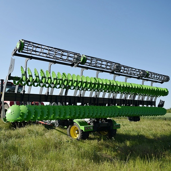Борона Carbon D8500 предназначена для поверхностной стерневой обработки на лёгких и средних почвах, так и для предпосевной обработки почвы для посева по мульче или после вспашки. Может работать по влажной почве не забиваясь, идеально копирует практически любой рельеф почвы, за счет пружинной стоки, выдерживает заданную глубину по всей ширине захвата, работает на глубину от 3 см до 15 см. Carbon D4000 обеспечивает качественные показатели при соблюдении условий эксплуатации: уклон поля должен быть не более 8,5°, влажность почвы не более 30%, твёрдость почвы до 3,5 МПа в горизонтах от 0 до 15 см., необходимое давление в гидросистеме трактора до 20 МПа (200 атм.), в гидросистеме бороны не допускается наличие воздуха, в обрабатываемом слое почвы не должно быть камней и больших скоплений пожнивных остатков. Carbon D4000 состоит из рамной конструкции: сницы, комплектов гидроцилиндров, транспортной тележки, не складываемой рабочей плоскости, на несущих брусьях которой в два ряда установлены рабочие органы на пружинных S-образных проворотных стойках - 90*14 см, вслед за рабочими органами располагаются катки (одинарные или двух рядные), которые выполняют функцию прикатывания почвы и дробления комьев. Рама выполнена из бруса и листового металла и имеет толщину от 7 мм до 20 мм.