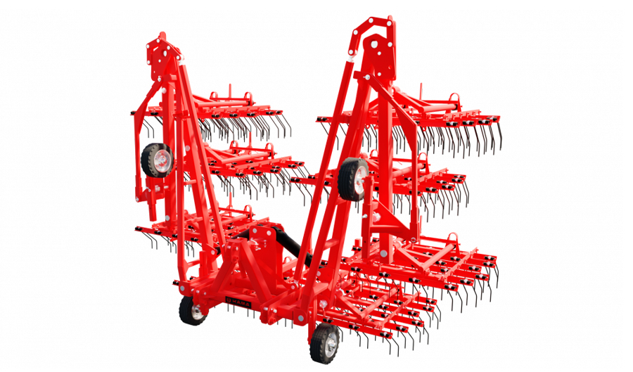 Легкая борона «Кама-штригель» оснащена пружинными зубьями со специальной гидравлически складной рамой. За счет пружинного зуба, производится мульчирование почвы и вычесывание сорняков.