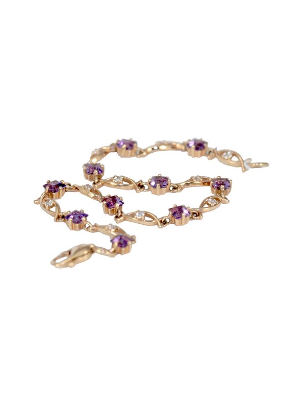 Браслет БР-8004-01 - это изысканное ювелирное украшение, сочетающее благородный металл с фиолетовым кварцем. Он служит для создания элегантного образа, подчеркивает стиль, а также используется как талисман для привлечения гармонии, защиты от стресса, развития интуиции и укрепления искренних чувств. В золотой оправе аметист помогает восстанавливать и поддерживать баланс энергии человека. Вес изделия - 6,78 гр. Вставки - 8 шт. аметистов- d 0/2, весом - 25 карат., 8 фианитов - весом 0,5 карат.