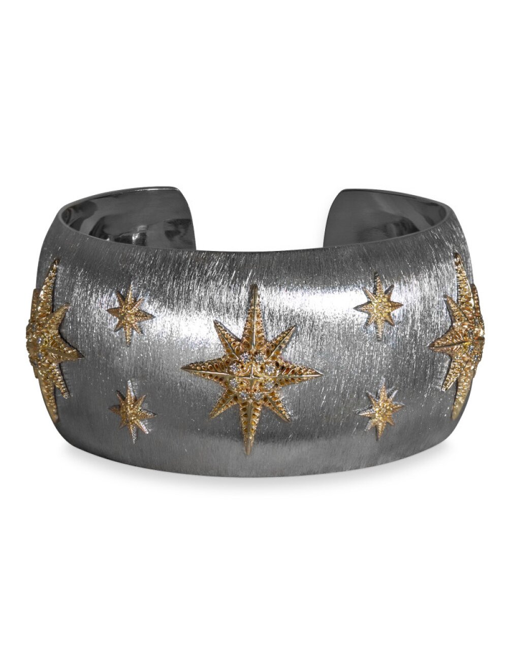 Браслет "Звёздная ночь" - это изысканное ювелирное украшение, сочетающее фактурное серебро 925 пробы с элементами из золота (часто 585 пробы), создающее эффектный контраст. Оно предназначено для подчеркивания романтичного, загадочного образа, символизируя космос, мечты, судьбу, а также может выступать в роли защитного амулета. Металл - золото 585 пробы, серебро 925 пробы. Вес - 54 гр. Вставки - 24 цветных бриллианта кр57 0,38 карат.