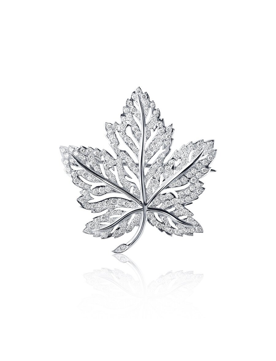 Брошь "Кленовый лист" из платины с бриллиантами - это изысканное ювелирное украшение, символизирующее растительные мотивы. Воплощение приземлённых на первый взгляд, но носящих символический смысл, вещей в драгоценных аксессуарах - чисто аристократическая манера, имеющая место по сей день. Вся брошь усыпана сверкающими бриллиантами, чей блеск многократно умножается будучи отражённым в зеркальной платине. Платина 950 пробы. Вес - 5.66 гр. Высота - 30.70 мм. Ширина - 28.80 мм. Игла - 26.7 мм. Вставки броши: 150 бриллиантов диаметром 1.00 мм, весом 0,750 карата, 4/5 А; 37 бриллиантов диаметром 0.80 мм, весом 0.111 карата, 4/5 А.