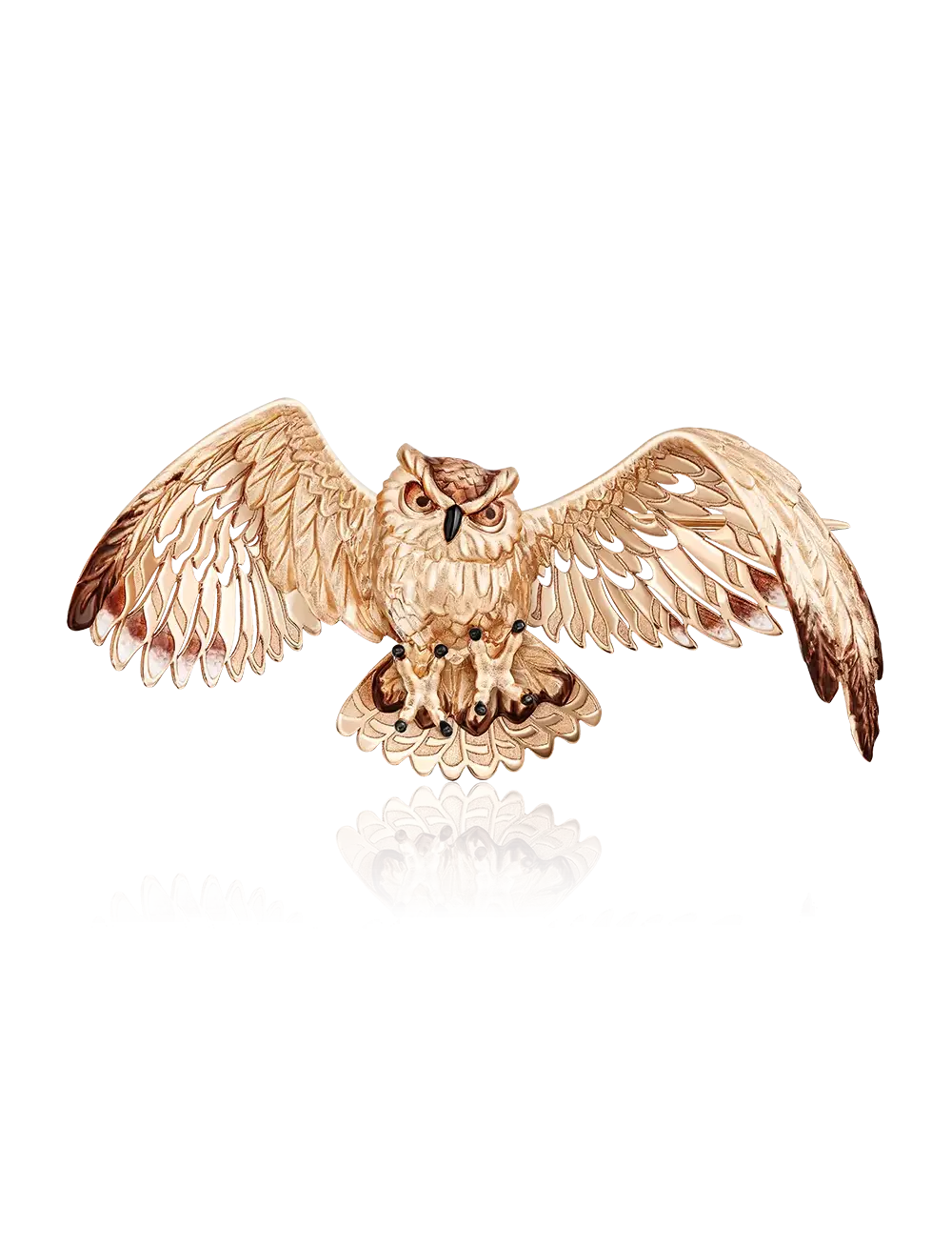 Брошь "Сова" Выполнена в стиле анималистика. Дополняет дизайн роспись эмалью, выполненная вручную. Удобный и надёжный замок-булавка обеспечивает комфорт при длительном ношении. Брошь подойдёт для делового гардероба, а также для торжеств, светских и культурных мероприятий, и для повседневного ношения. Металл - красное золото 585 пробы. Средняя масса - 4.10 г. Покрытие - родий, эмаль.