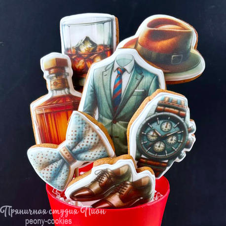Оригинальный подарок мужчине на 23 февраля в виде букета в кашпо с классическими атрибутами делового мужчины, бизнесмена. В этом букете Представлены пряники пиджак (деловой костюм), часы, шляпа, галстук-бабочка, туфли, бутылка виски и бокал виски.. Размеры пряников небольшие, сам букет компактный.