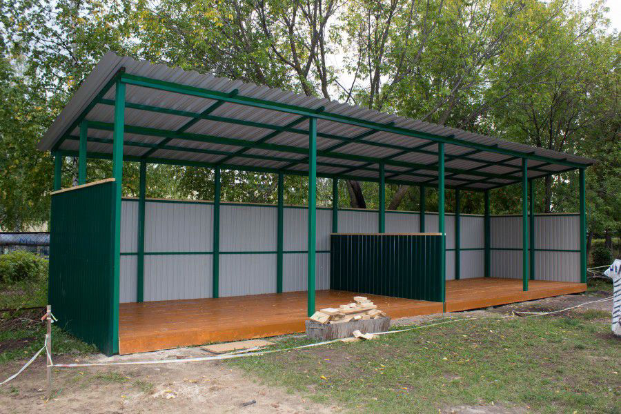 Бюджет стандарт сдвоенная веранда - это двойная прогулочная веранда, теневой навес, игровая площадка. Она используется для круглогодичного отдыха: закрытая часть защищает от холода, а открытая обеспечивает комфорт в теплое время. Совмещенный вариант. Габаритный расчётный размер: 4*10 (или 12) м, высота 2,5 мэ Пол - деревянный, половая доска 36 мм. Облицовка стен и крыши - профнастил С8 / НС35. Возможна облицовка стен сотовым поликарбонатом - 8-10 мм.