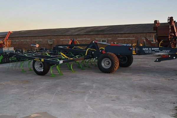 Carbon K6000 предназначен для сплошной предпосевной обработки почвы и ухода за парами с одновременным прикатыванием и выравниванием поверхности поля. Технологический процесс, выполняемый культиватором, заключается в следующем: при рабочем ходе культиватора по полю стрельчатые лапы рыхлят на заданную глубину поверхностный слой почвы, подрезают сорняки, а расположенные сзади пружинные зубья и катки выравнивают борозды, которые образуются от прохода рабочих органов. Carbon K6000 - это орудие с шириной захвата 6,0 м., оснащен стрельчатыми лапами шириной захвата 265 мм., шаг установки стрельчатых лап 225 мм., оснащен шлейфом, состоящим из пружинных бороновальных модулей, катков и выравнивающих планок, перевод из транспортного положения в рабочее и наоборот производится при помощи гидросистемы. Carbon K6000 обрабатывает почву под посевы зерновых, овощных и пропашных культур. Carbon K6000 должен эксплуатироваться в различных почвенно-климатических зонах России на почвах, не засорённых камнями и не подверженных ветровой эрозии.