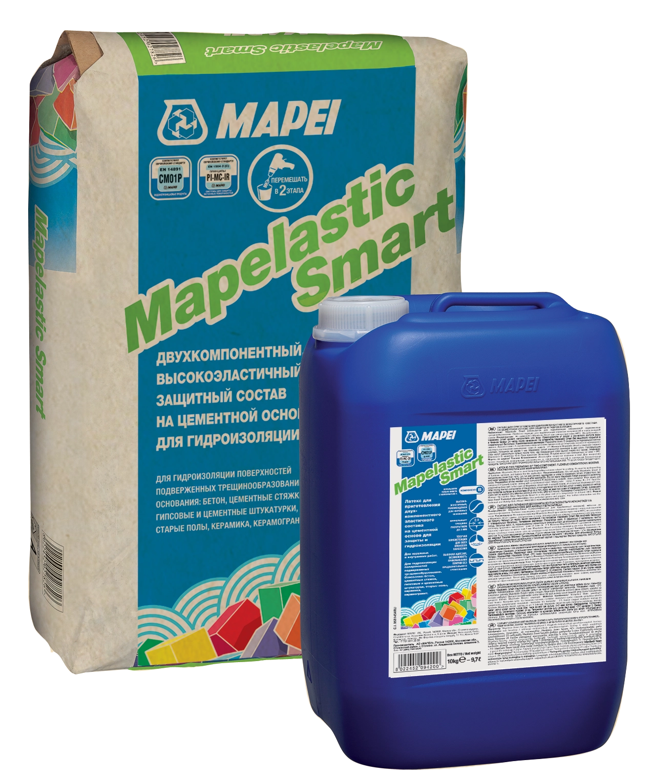 Цементно-полимерное высокоэластичное покрытие Mapelastic Smart для гидроизоляции плавательных бассейнов, душевых, ванных комнат, балконов и террас. Перекрывает активные трещины в основании более 2 мм.Mapelastic Smart применяется для защиты бетонных конструкций, конструкций имеющие волосяные трещины, а так же конструкции испытывающие динамические нагрузки склонные к образованию трещин.Mapelastic Smart также используют для гидроизоляции гидротехнических сооружений (каналы, дамбы, басейны, резервуары).Особенно подходит для гидроизоляции поверхностей не правильной формы.