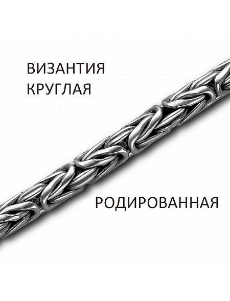 Цепь Византия круглая родированная - это высокопрочное, плотное ювелирное изделие из серебра 925 пробы с округлым сечением и сложным плетением. Сложный узор из переплетенных элементов создает объемную, массивную, но элегантную структуру. Круглая форма делает её идеальной для ношения как самостоятельного украшения, так и с подвесками. Нанесение родия - металла платиновой группы - защищает серебро от потускнения, царапин и окисления, значительно продлевая срок службы. Ширина - 3 мм. Диаметр - 0,60 мм. Металл - серебро 925 пробы.