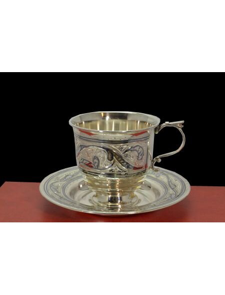 Чашка с Блюдцем (чайная пара) - это элитный набор посуды из драгоценного металла (обычно 875 или 925 пробы), используемый для чаепития, сервировки стола, подчеркивания высокого статуса, а также в качестве ценного подарка. Серебро обладает антисептическими свойствами, обеззараживает напиток, а сам набор служит элементом декора. Вес набора- 175-190 гр. Объем- 150 мл. Размеры: чашка - 70*70 мм., тарелка диаметром - 123 мм.
