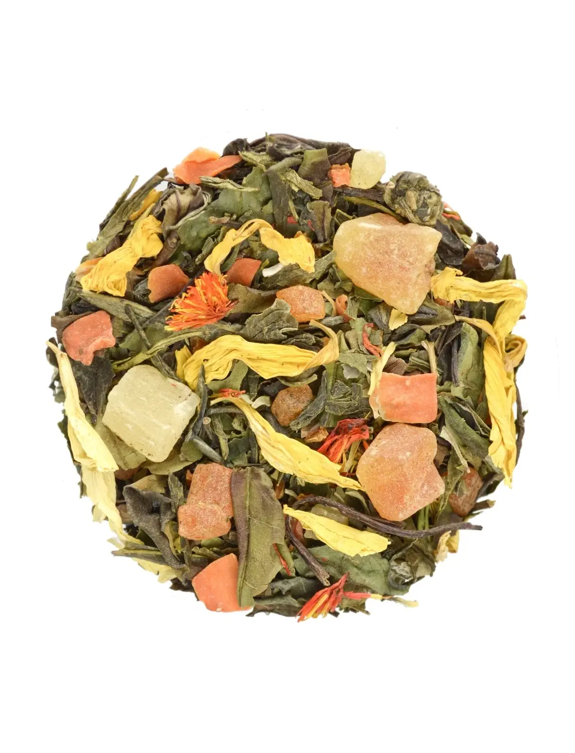 Купаж белого и зеленого чая с цукатами папайи и ананаса и листом грецкого ореха с добавлением лепестков подсолнечника, сафлора и хлопьев моркови.