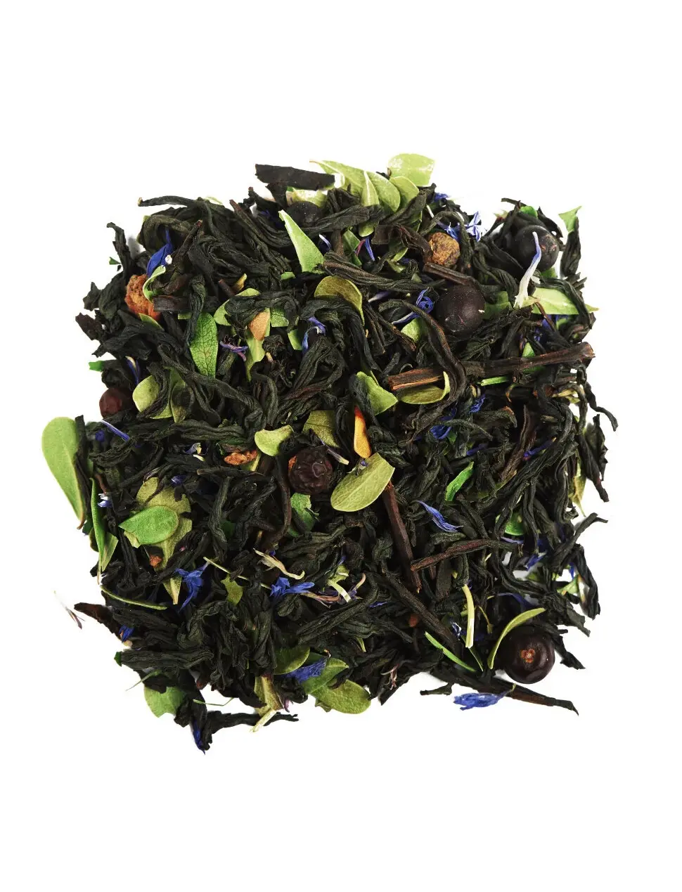 В состав чая входят классические сорта чёрного чая, лист толокнянки, ягоды можжевельника, мята, кусочки ягод клубники и лепестки василька. Состав этого чая полностью натуральный, без ароматизаторов.